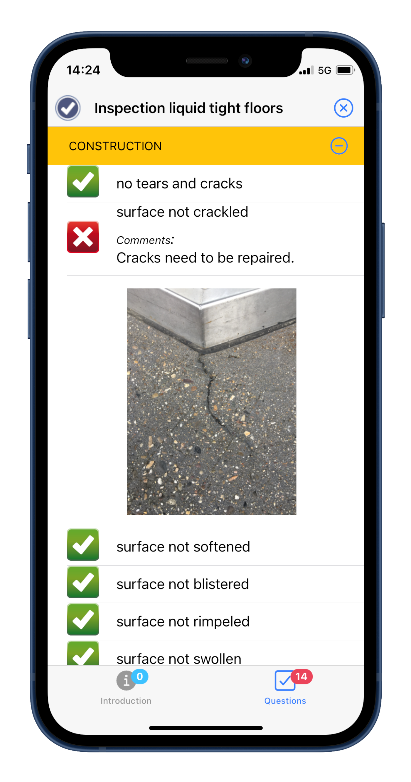 Bovendien kan met de 'scorevraag met een percentage' bijvoorbeeld een slijtagepatroon worden aangegeven zonder dat dit leidt tot afkeuring en onmiddellijke noodzaak tot reparatie. De follow-up van afwijkingen kan worden beheerd door onze gedetailleerde actiemodule.